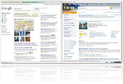Google displays related news as topmost results, while Bing puts up theater showtimes near your location.